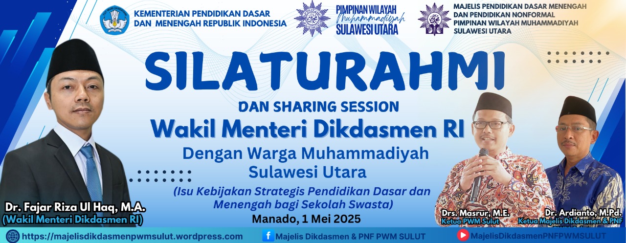 Manado, 1 Mei 2025 — Wakil Menteri Pendidikan Dasar dan Menengah Republik Indonesia, Dr. Fajar Riza Ul Haq, MA (sapaan akrab mas wamen), melakukan kunjungan silaturahmi dengan warga Muhammadiyah se-Sulawesi Utara pada Kamis, 1 Mei 2025. Kegiatan ini berlangsung di Sekretariat Pimpinan Wilayah Muhammadiyah (PWM) Sulawesi Utara, lantai 3 Gedung Tokomu Manado yang digagas langsung oleh Majelis Dikdasmen dan PNF PWM Sulawesi Utara.